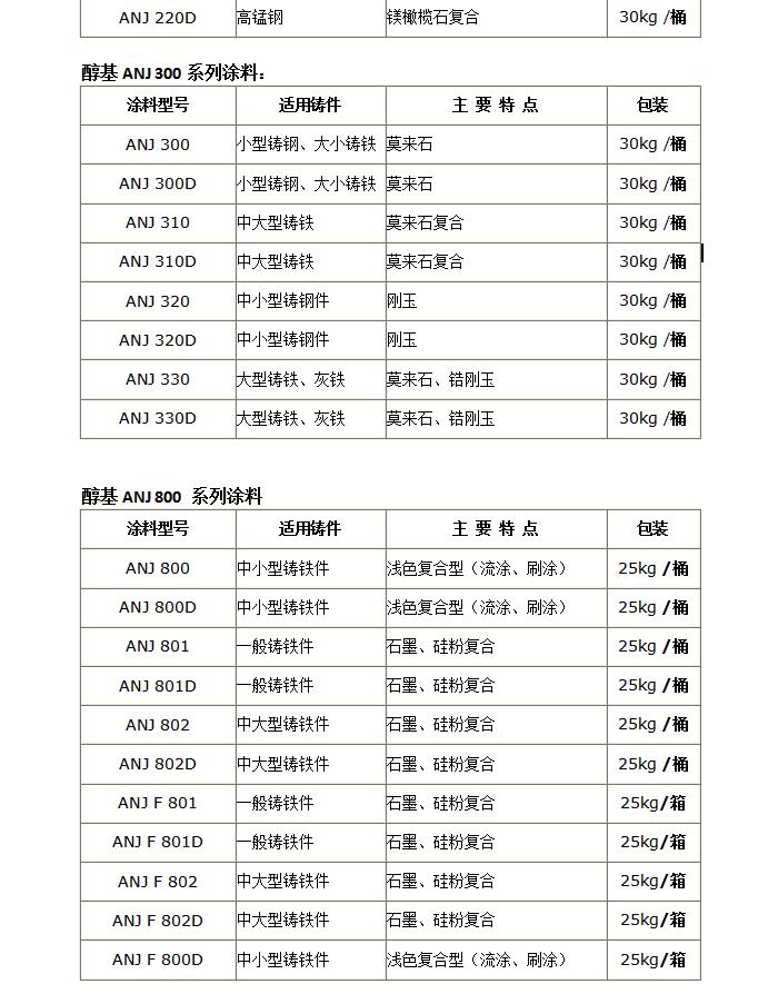 安耐捷公司ANJ醇基系列涂料,有著良好的流平性和觸變性,涂層無(wú)刷痕,懸浮性穩(wěn)定,發(fā)氣量小,易點(diǎn)燃,涂層強(qiáng)度高,不開(kāi)裂,不起泡。耐火度高,鑄件表面光潔易清理。
