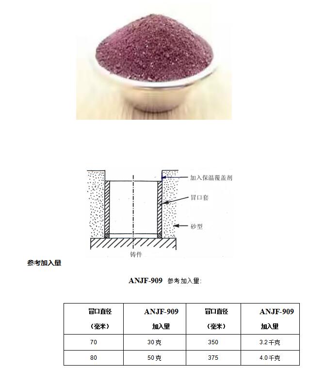 ANJF-909 發(fā)熱保溫覆蓋劑施加于明冒口頂部之后,能形成低密度絕熱層,防止或在很大程度上減低了熱輻射、熱傳導和熱對流作用,也避免了冒口頂部過早結殼。如果配合優(yōu)質冒口使用,冒口解剖后縮孔呈平鍋底狀。